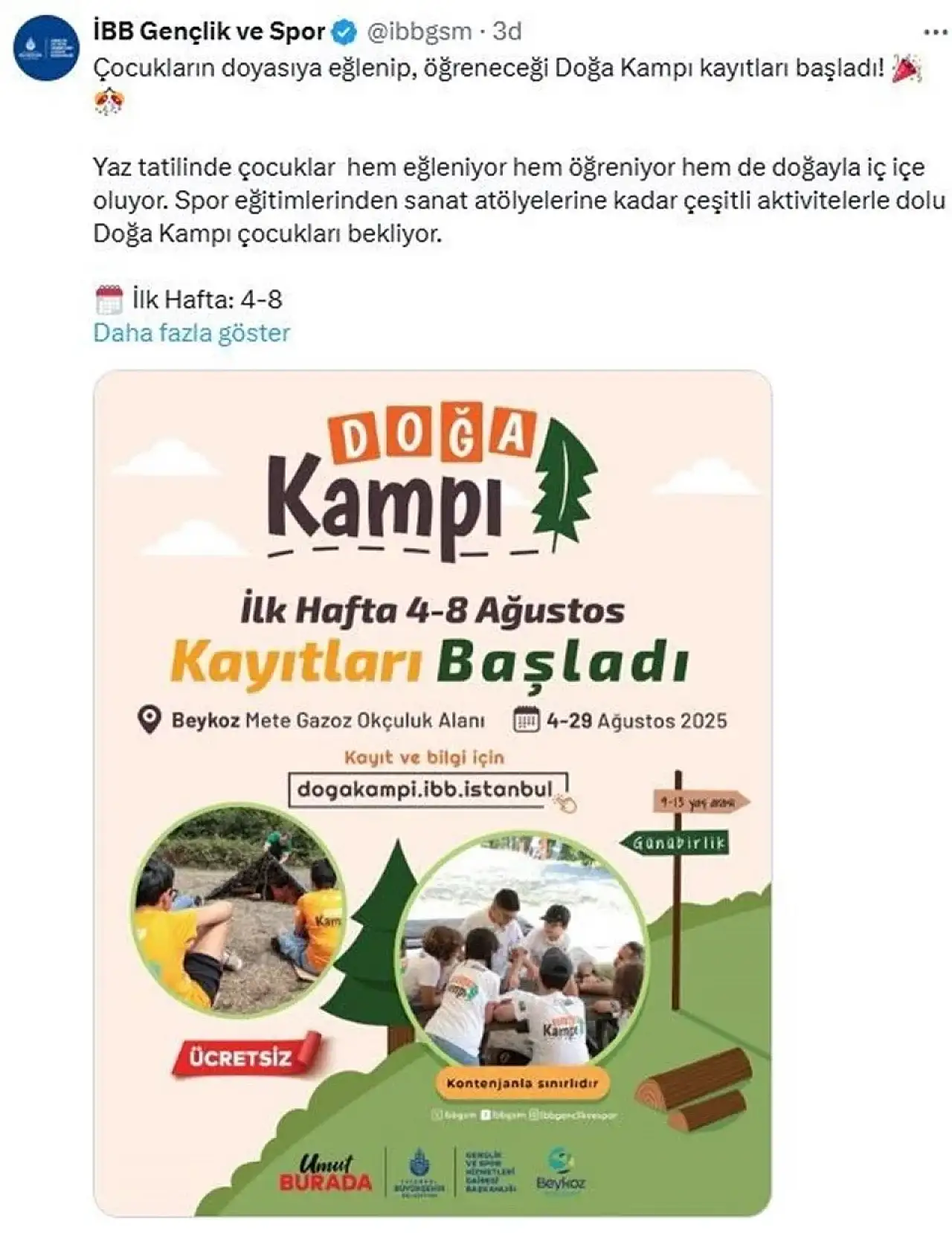 İstanbul Büyükşehir Belediyesi (İBB) tarafınca düzenlenen ve doğayla iç içe keyifli etkinlikler sunan İBB Doğa Kampı için kayıtlar başladı. Yaz tatiline renk katacak bu hususi kamp, 9–13 yaş arası küçüklere hitap ediyor.
