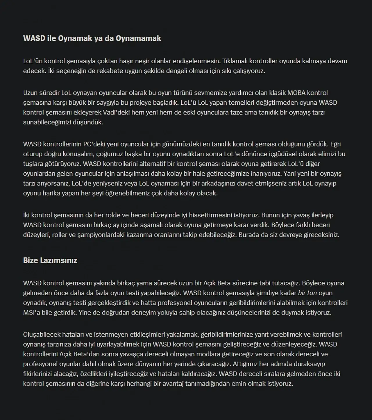 “LoL’ü LoL yapan temelleri değiştirmeden WASD kontrol şemasını ekleyerek, Vadide hem yeni hem de eski oyunculara taze ama tanıdık bir oynayış tarzı sunmayı amaçlıyoruz. WASD, PC’deki yeni oyuncular için en tanıdık kontrol şekli. Bu sayede diğer oyunlardan gelen oyuncular için LoL daha kolay öğrenilebilir hale gelecek.”